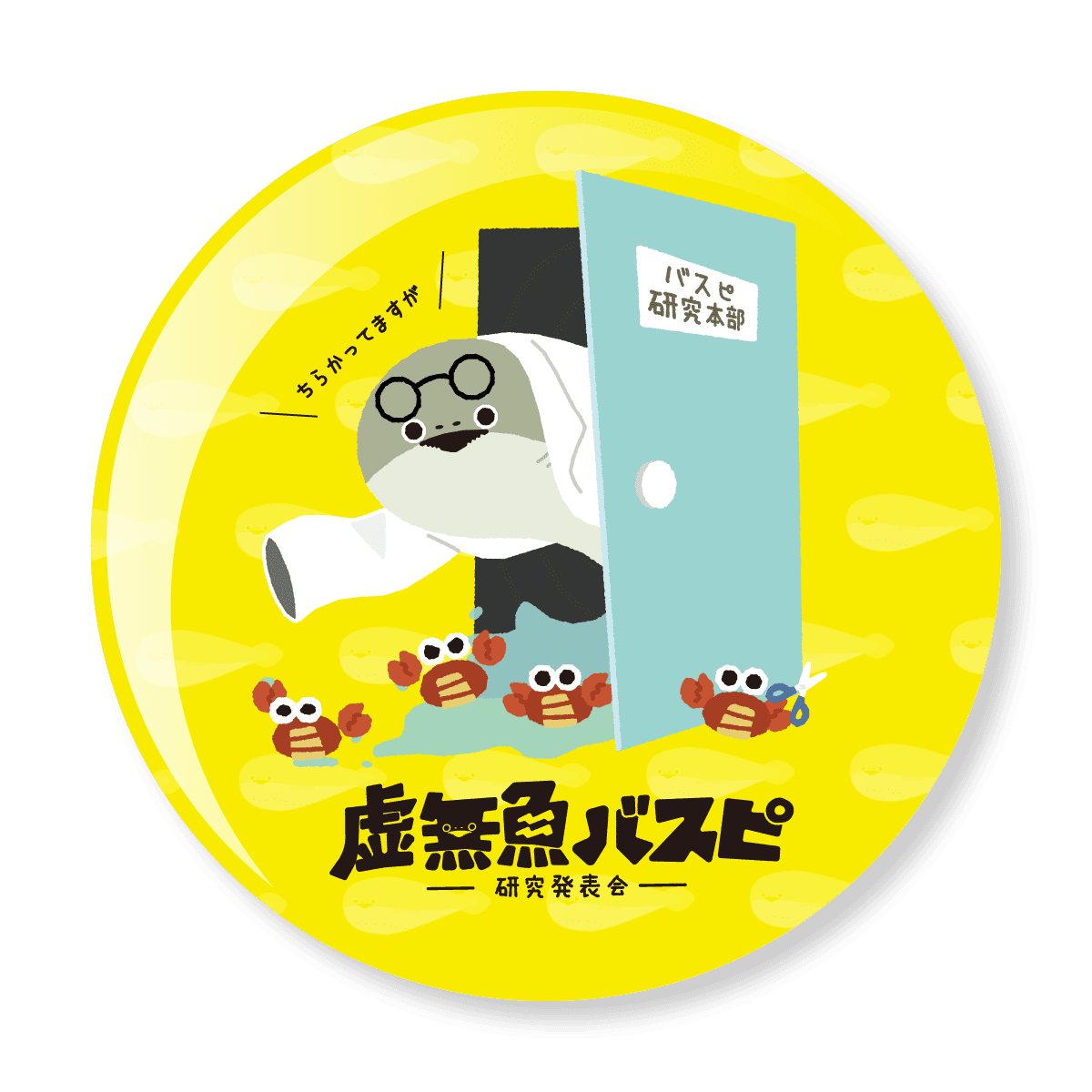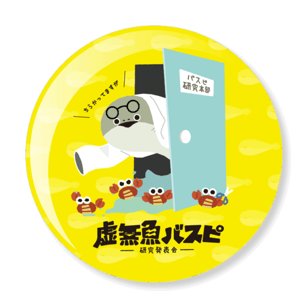 バスピPOPUP研究発表会のポスターにもなった、バスピ研究員とカニさんのかわいい缶バッジ!